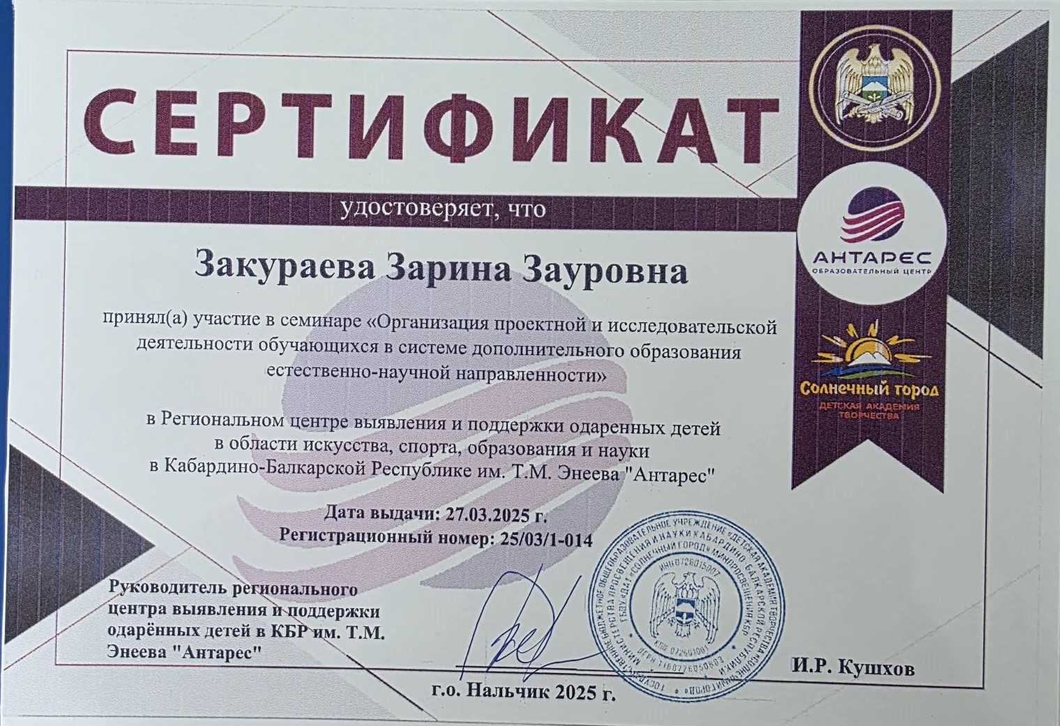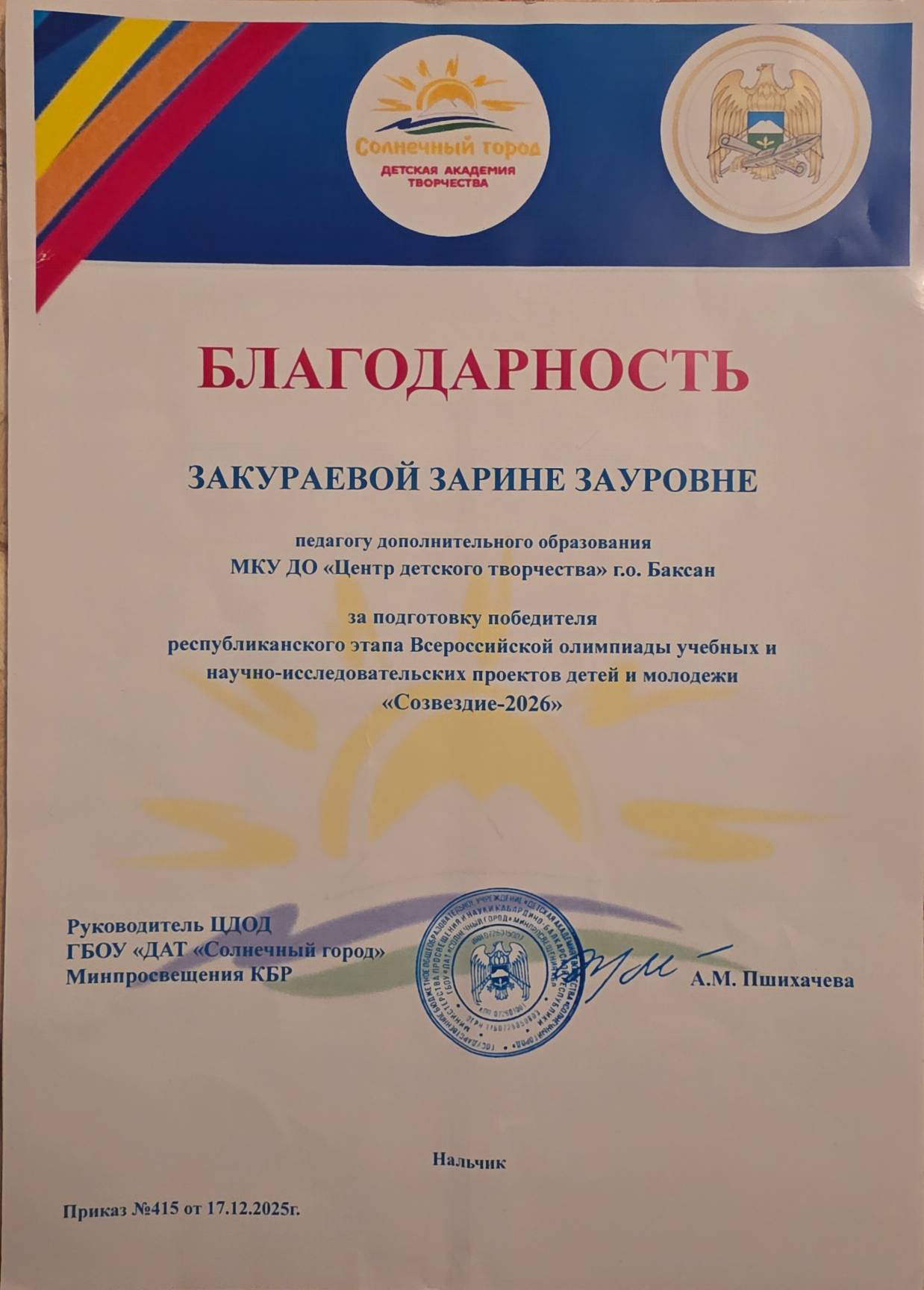 - 2025 г. - Благодарность ЦДОД ГБОУ "ДАТ "Солнечный город" Минпросвещения КБР, за подготовку победителя республиканского этапа Всероссийской олимпиады учебных и научно-исследовательских проектов детей и молодежи "Созвездие-2026" (смотреть)