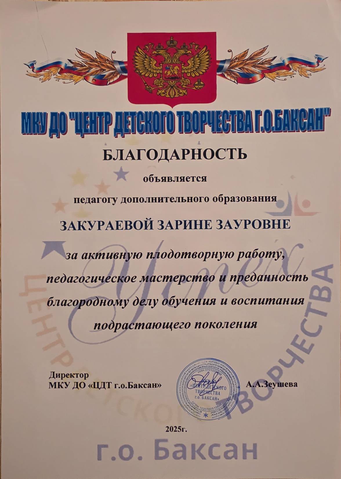 - 2025 г. - Благодарность МКУ ДО "Центр детского творчества г.о.Баксан", за активную плодотворную работу, педагогическое мастерство и преданность благородному делу обучения и воспитания подрастающего поколения (смотреть)