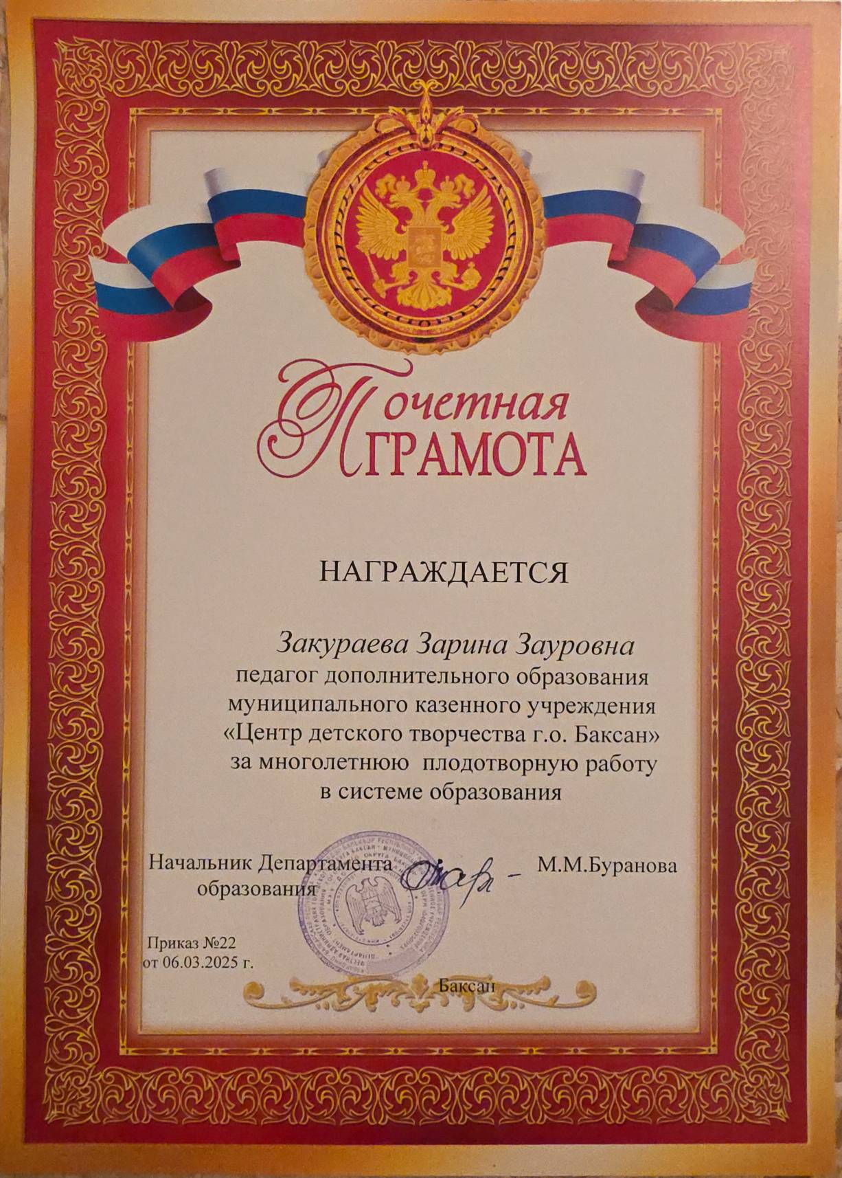 - 2025 г. - Грамота Департамента образования г. о. Баксан, за многолетнюю плодотворную работу в системе образования (смотреть)