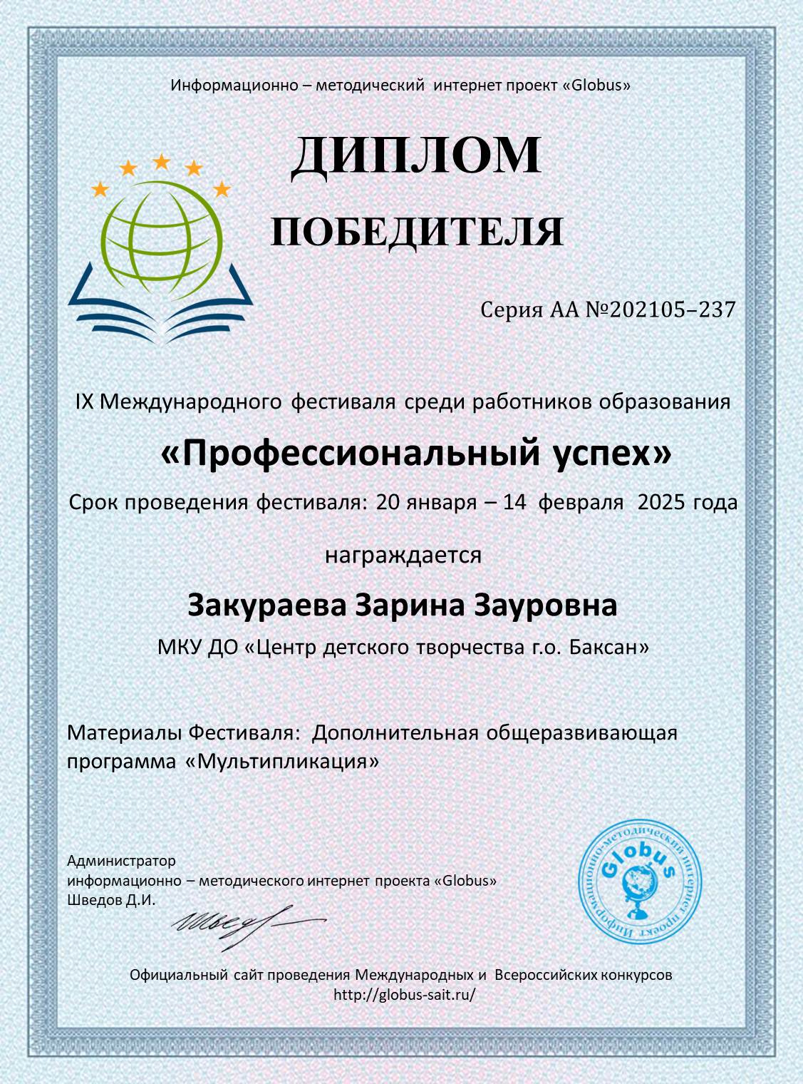 - 2025 г. - Диплом победителя IX Международного фестиваля среди работников образования "Профессиональный успех" по программе Мультипликация" (смотреть)
