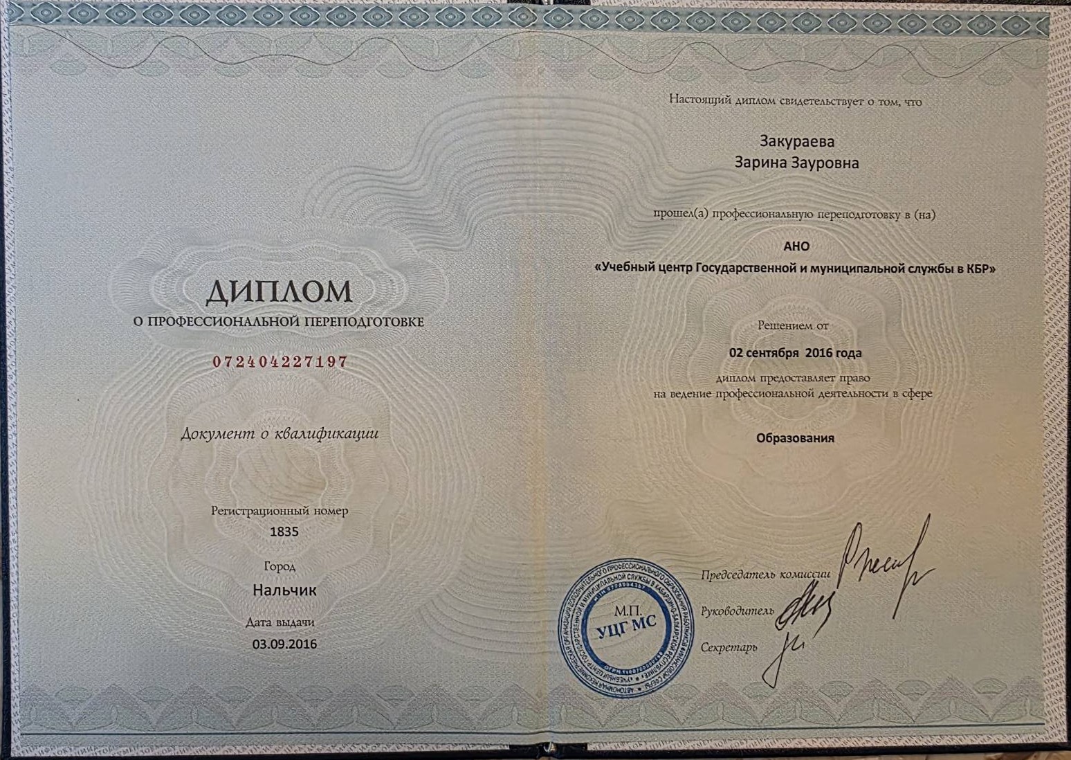 - АНО "Учебный центр Государственной и муниципальной службы в КБР", 2016 г. (смотреть)
