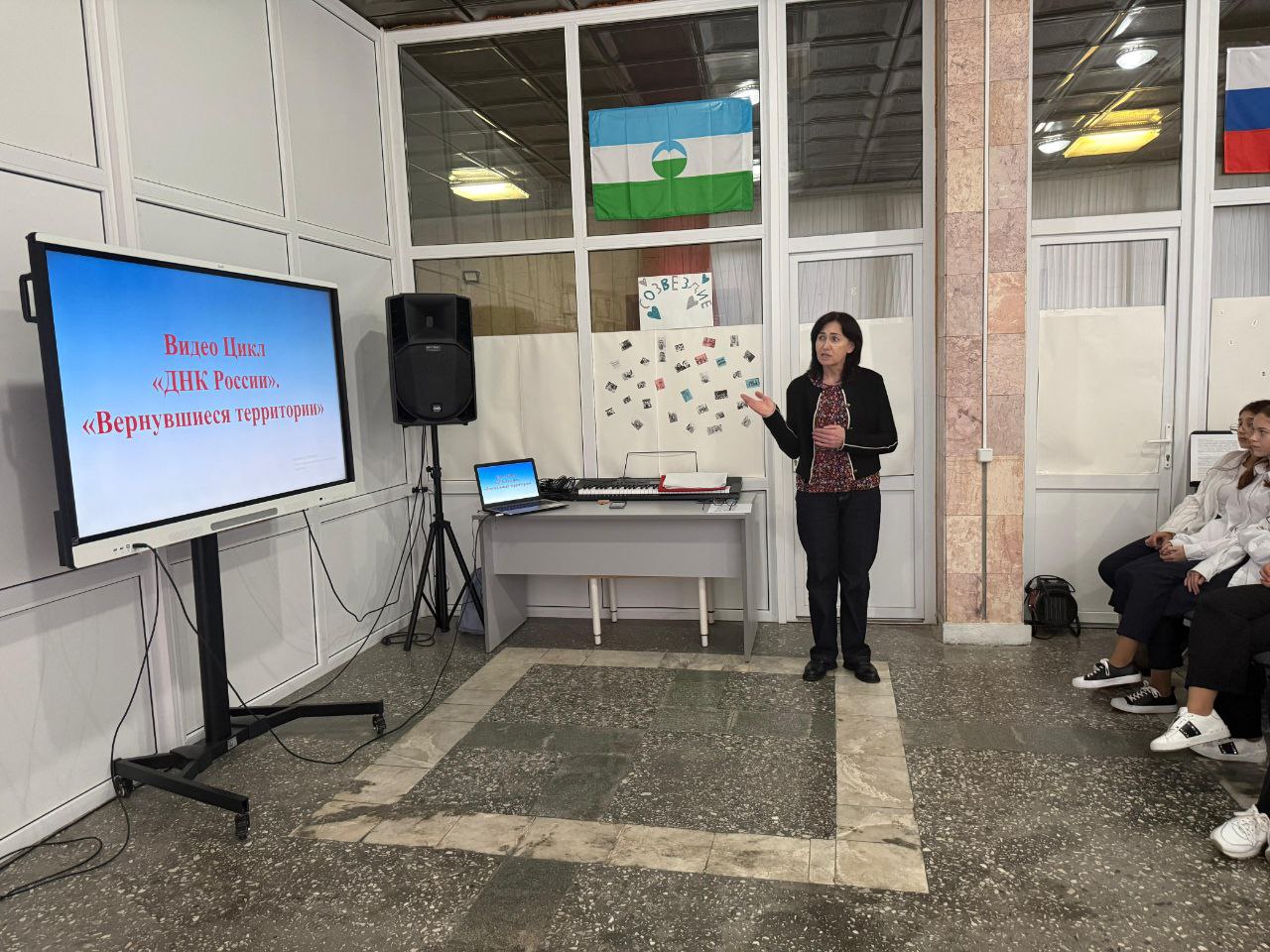 На встрече ребята посмотрели фильм «ДНК России. Вернувшиеся территории», предоставленный РО «Знание». Фильм повествует о Крыме и Севастополе, Запорожской и Херсонской областях, Донецкой и Луганской республиках, их природных богатствах и традициях жителей, исторической связи с Россией.