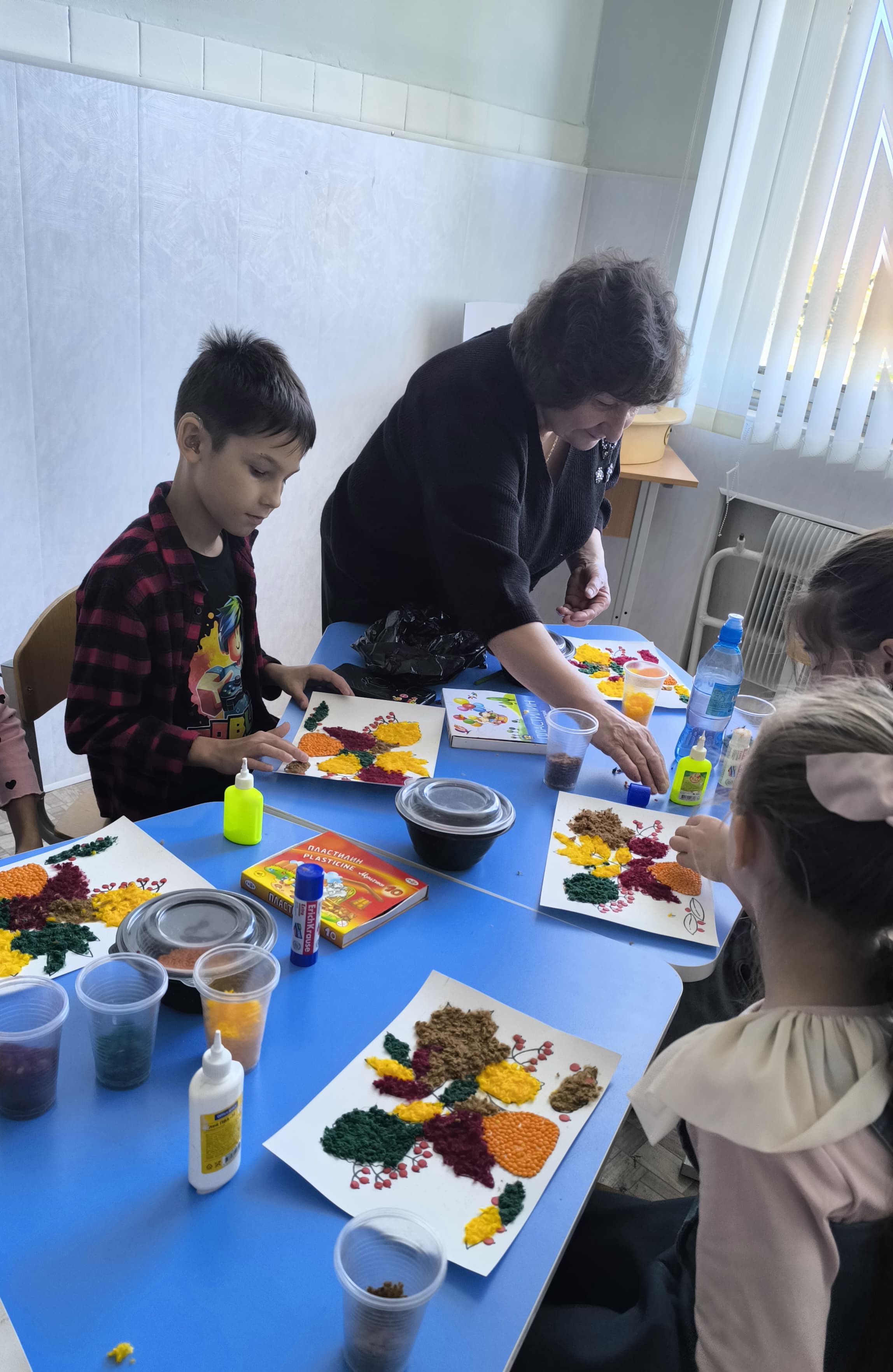 Для изображения красок осени, педагог Шокуева Р.Н. предложила ребятам использовать обрезки шерсти, крупы и другие натуральные компоненты.