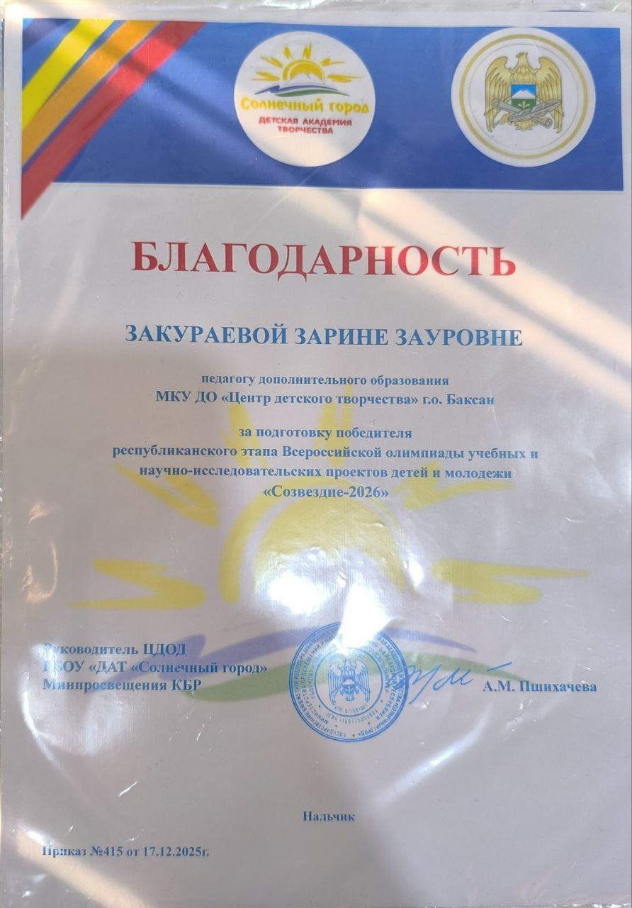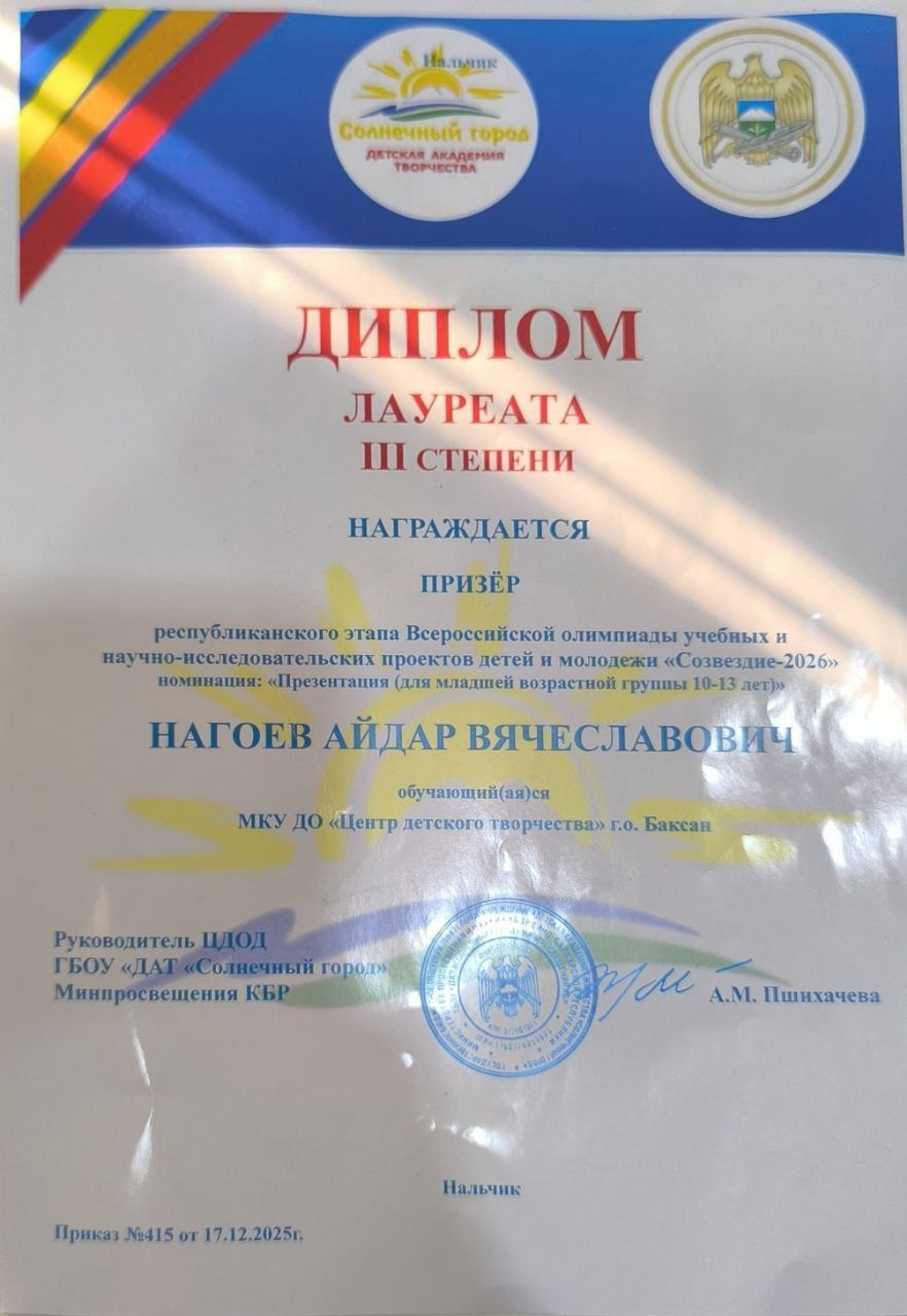 Обучающийся объединения «Мультипликация» Центра детского творчества г.о.Баксан Нагоев Айдар Вячеславович стал лауреатом lll степени республиканского этапа Всероссийской олимпиады учебных и научно-исследовательских проектов детей и молодежи «Созвездие-2026». Руководитель - Закураева Зарина Зауровна.