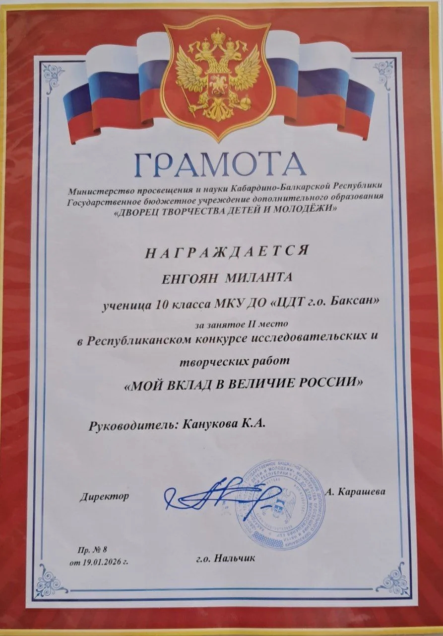 В номинации «Обществознание, психология, социология» 2 место заняла Енгоян Миланта, обучающаяся объединения МКУ ДО "ЦДТ г.о. Баксан" с исследовательской работой «Путешествие в психологию».